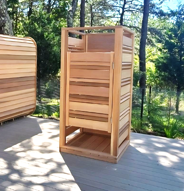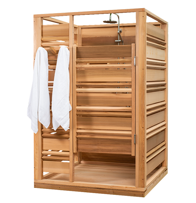The Cloudburst Outdoor Shower features a modern privacy wall design with a self closing door mounted with stainless steel hinges. Enjoy this free standing outdoor shower at your cottage or in your backyard to cool down after a sauna session, swim in the lake or pool or to rinse down after relaxing in your hot tub.