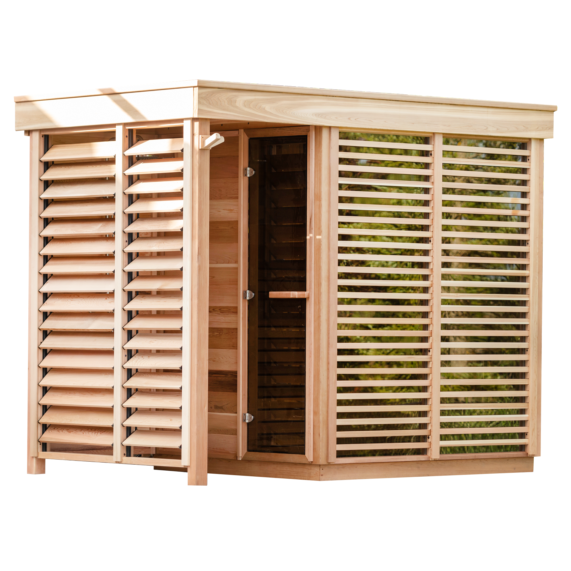 The Pure Cube CU580D CU582D Outdoor Sauna DUAL Model is another sophisticated design that has a built in outdoor shower on 1 end with louvered privacy panels and stainless steel shower fixture. Create a calm and relaxing atmosphere with the optional semi-privacy panels that still have the double pane glass with a fixed cedar grill on the outside. The Shower section can be installed on the left or right side of the sauna as the kit is built universal so you can determine that during installation.