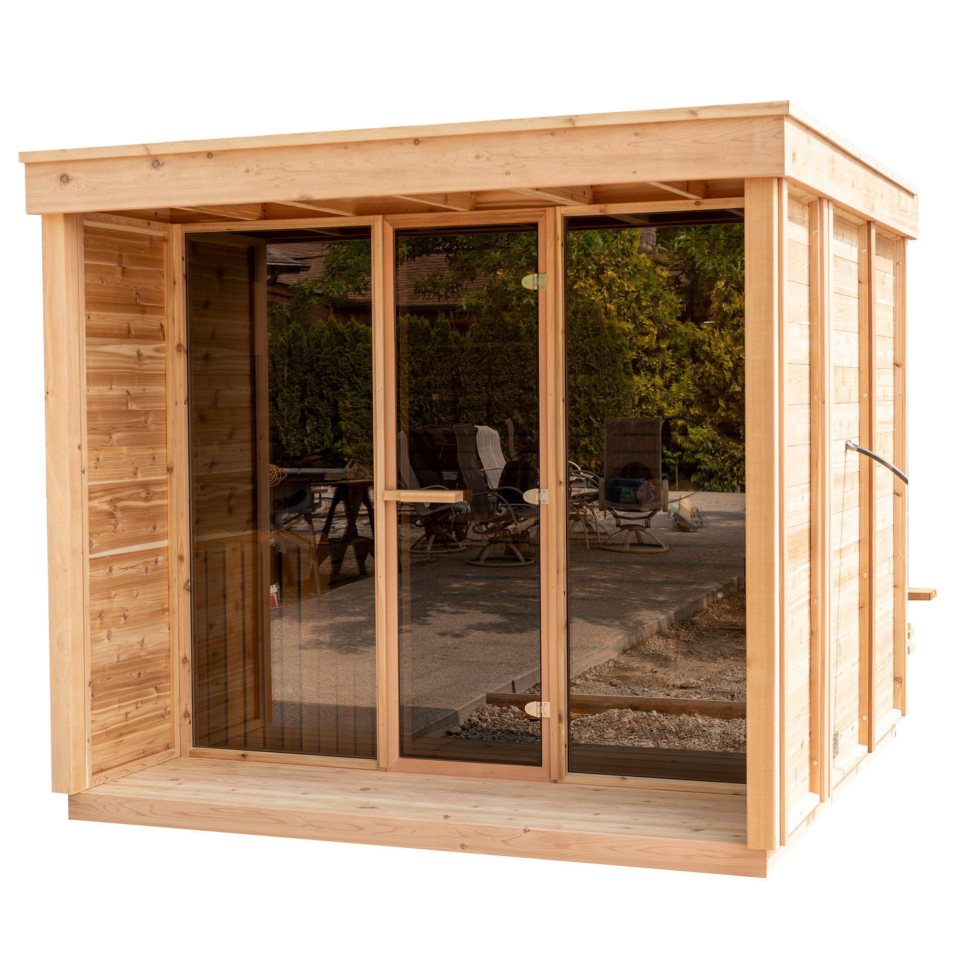 The Pure Cube CU670P CU672P Outdoor Sauna offers the same interior and heater options as the Pure Cube CU670 CU672 model but now with an elegant front porch area. This stunning design has a full glass door in the middle of the front wall with various panel options you can enjoy the freedom of the outside all within this spacious model. With the full 2 Tier L Benches this model is our largest Pure Cube Sauna yet!