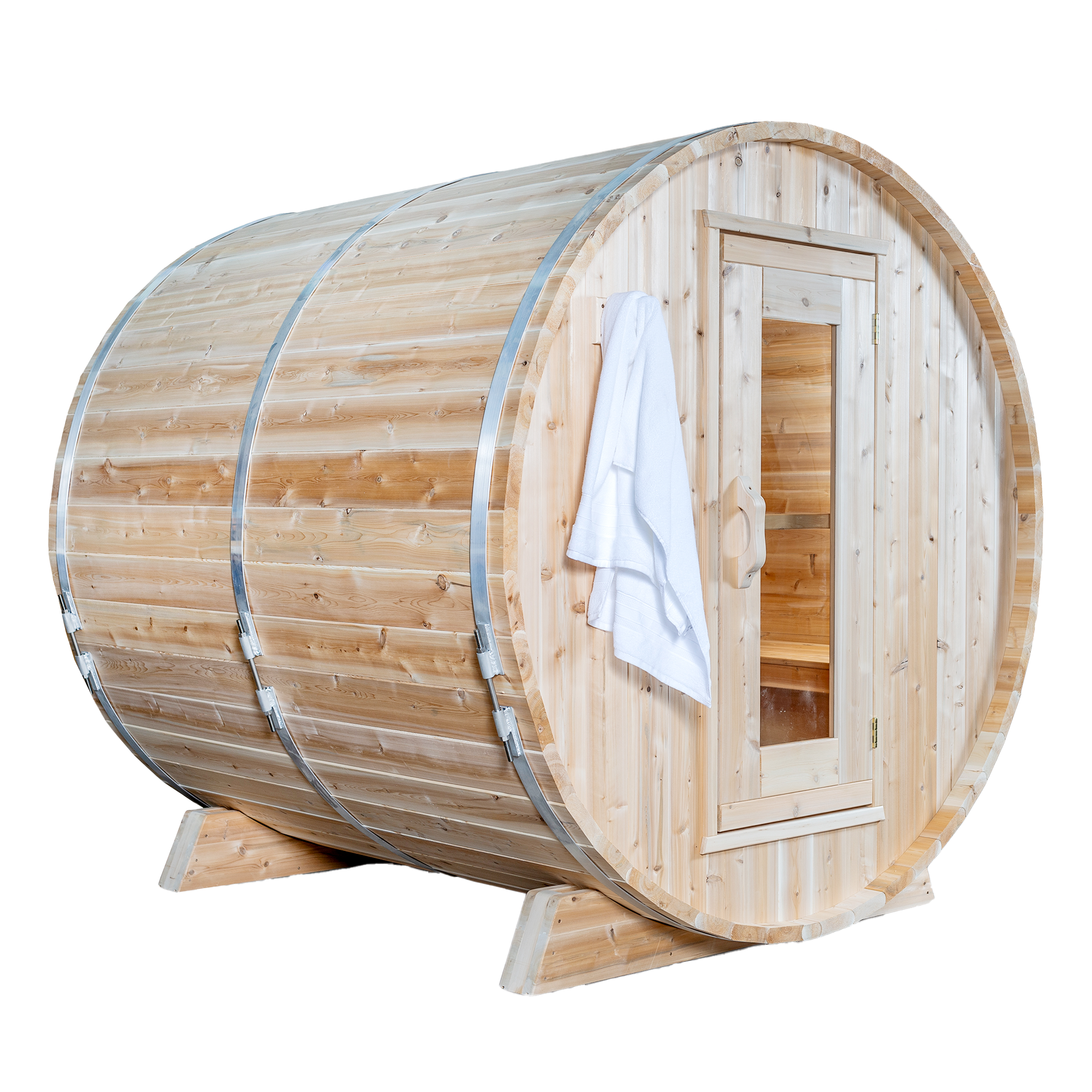 This Canadian Timber Collection Harmony Sauna by Dundalk LeisureCraft is handcrafted from Eastern White Cedar that is lighter in color and has tight knots in the wood. This Sauna kit comes with solid cedar cradles, aluminum bands with stainless steel hardware and is packaged in a ready to assemble kit. This Sauna seats 2-4 people making it the perfect backyard getaway for you, your spouse and small family.