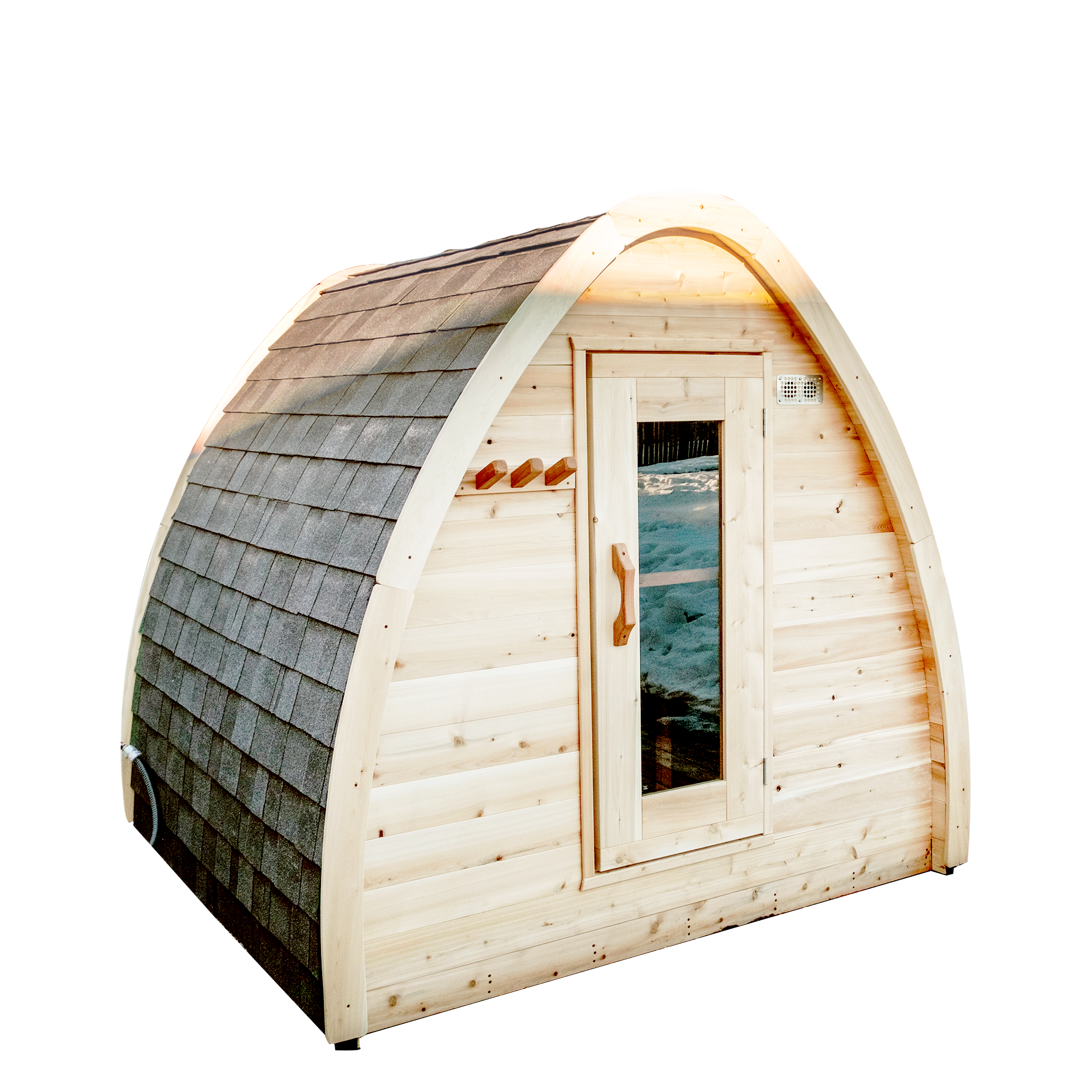The CT MiniPOD Sauna is a 7x7 (184cm) Sauna with side wall benches to seat up to 4 people sitting up or 2 people laying down. This model is also handcrafted in Canada with Eastern White Cedar lumber that is 1.5" (35mm) thick and select tight knot grade. The door features a large tempered glass window and the outside walls are protected with black asphalt shingles. This easy to assembly kit is available with wood burning or electric sauna heater.