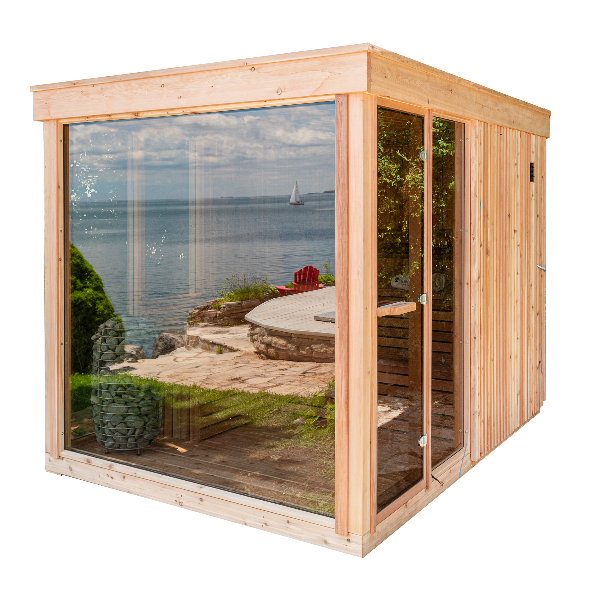 The Pure Cube Orion Sauna truly is a bathing experience like never before in a Leisurecraft Sauna, with the 180 degree view through the bronze tempered glass units you can have a sauna session and still feel like you are sitting on your dock or deck. This easy to assembly kit comes with insulated walls, roof and floor and black metal siding on the outside. Optional side wall benches and sauna accessories this model is only available with floor standing electric heaters.