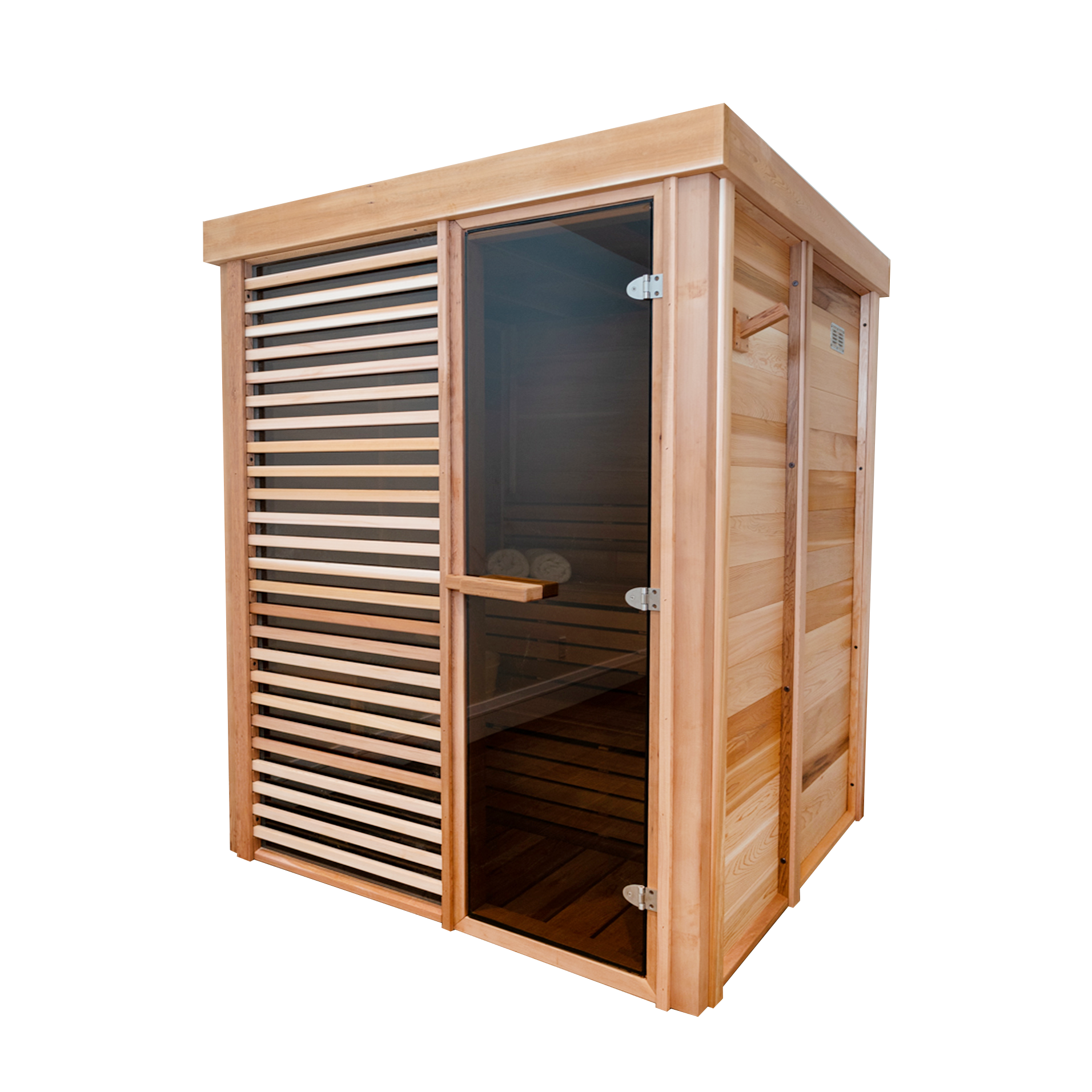 The Pure Cube PU550 PU552 Indoor Sauna is an attractive and stylish design that features a large window panel on the front wall beside the full glass door. Modernize your indoor space with optional semi-privacy panels that still feature the double pane glass with a fixed cedar grill on the outside. The Pure Cube PU550 PU552 Indoor Sauna comes in easy to assemble wall and roof panels and prebuilt solid cedar benches and duckboard floor. This model comes with an electric heater and comfortably sits up to 2 adults. Comfortable and cozy the Pure Cube PU550 PU552 Indoor Sauna is great for couples or small families.