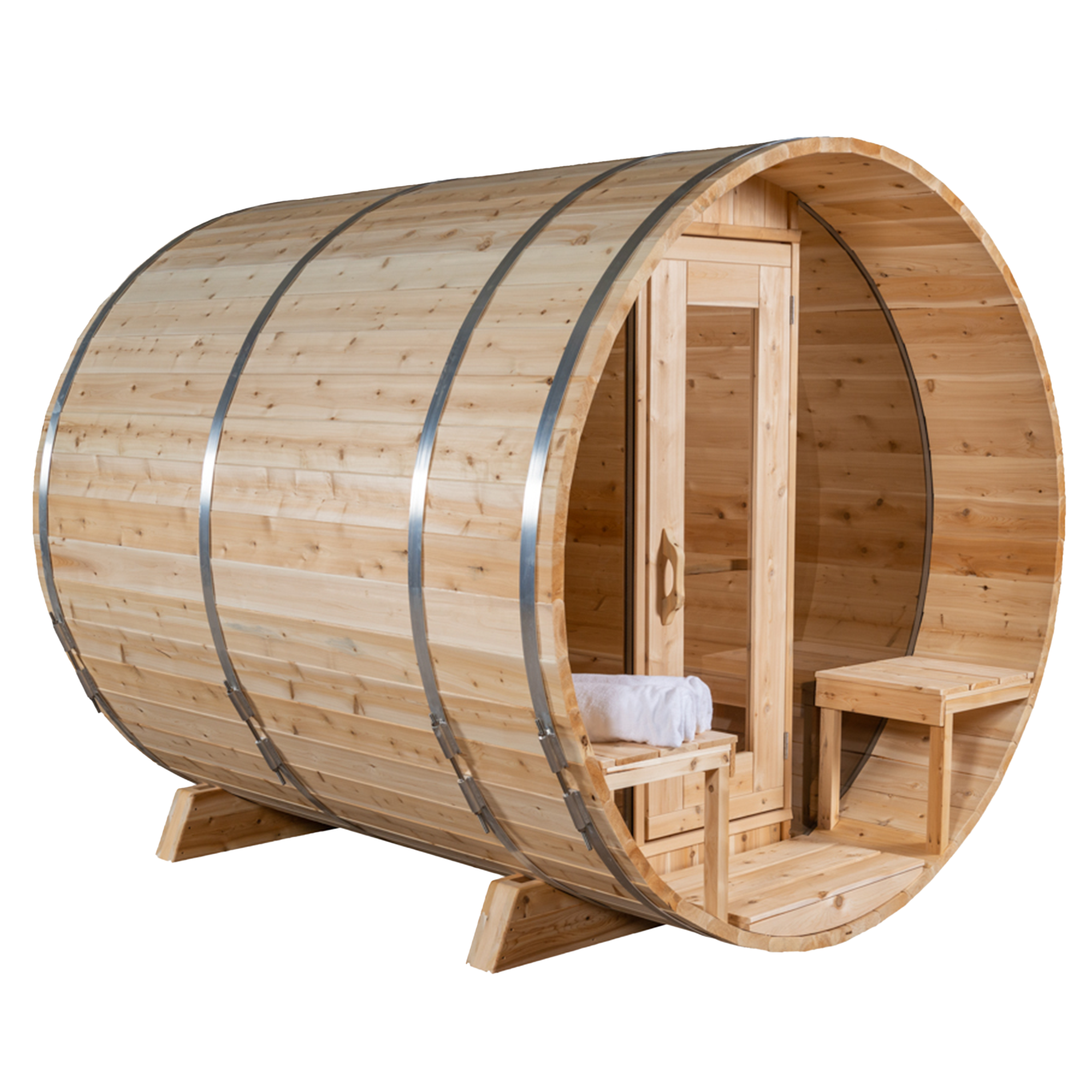 This Canadian Timber Collection Sauna by Dundalk LeisureCraft is handcrafted from Eastern White Cedar that is lighter in color and has tight knots in the wood. The door is 5mm bronze tempered glass with wooden frame and pre-hung on the front wall for easy installation.