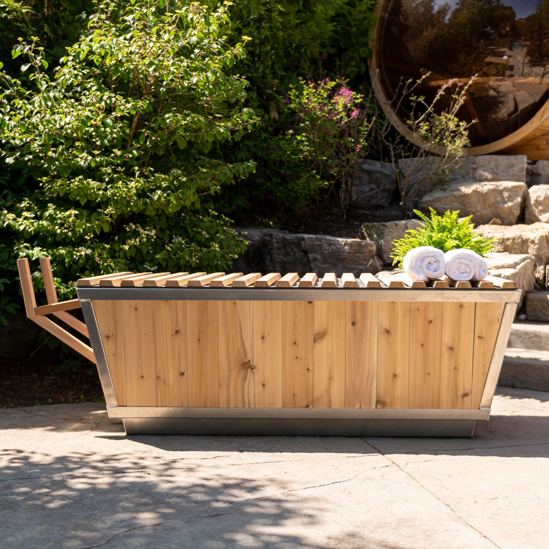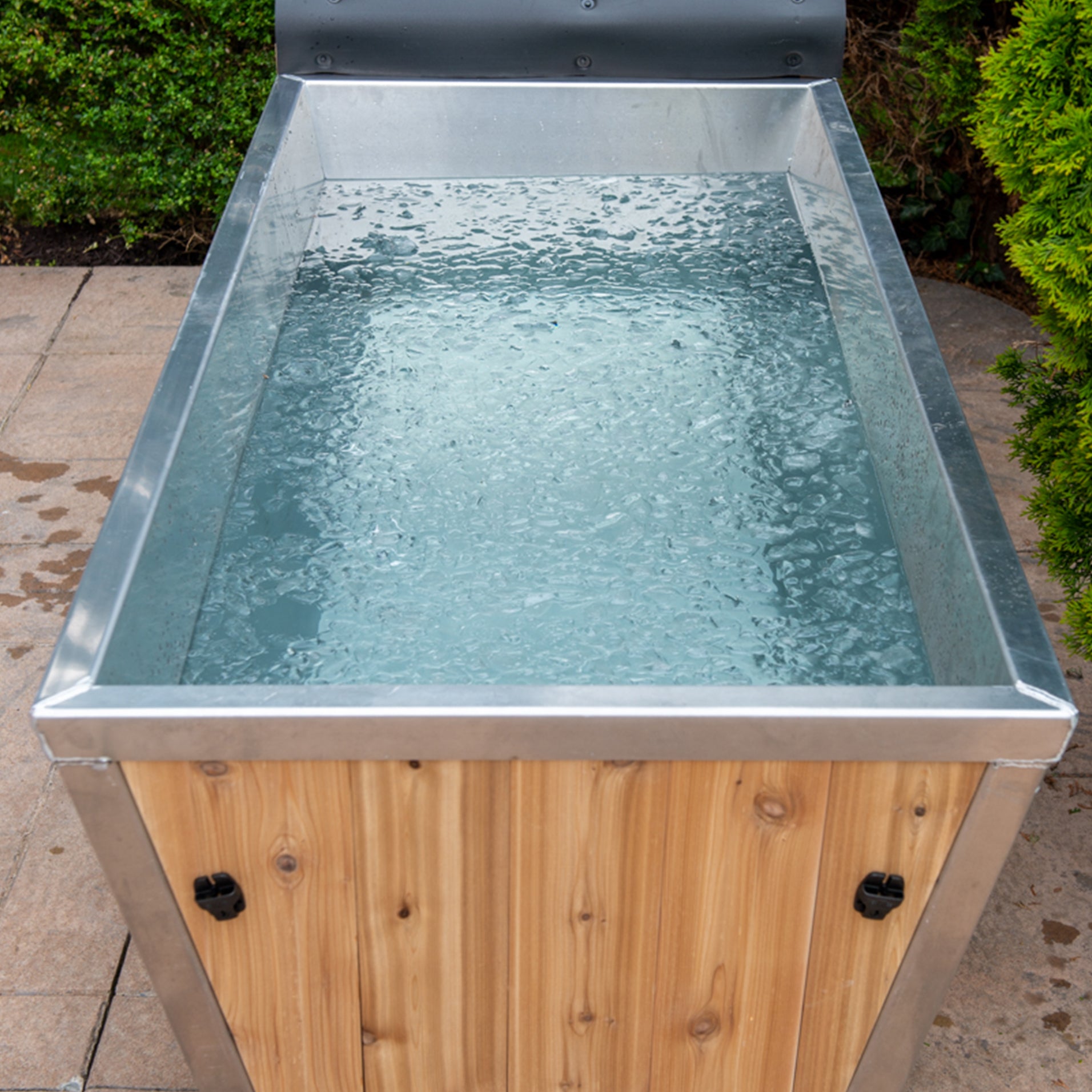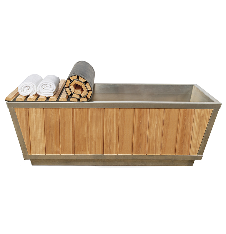 The Glacier Cold Plunge Tub is the first in its class, manufactured in Canada by Leisurecraft. Now available with either 304 Stainless Steel Interior or white HPDE Plastic and clear or knotty red cedar skirt. This new and improved model is your quality solution for cold plunge therapy with or without a sauna. The optional roll up cover will keep your water clean when not in use and an easy to use drain that will connect to any garden hose is included with all cold plunge tubs. The total outside measurement is 71"x33"x25" High with angled sides for easy in and out access and will hold 190 gallons (720 litres) of water.