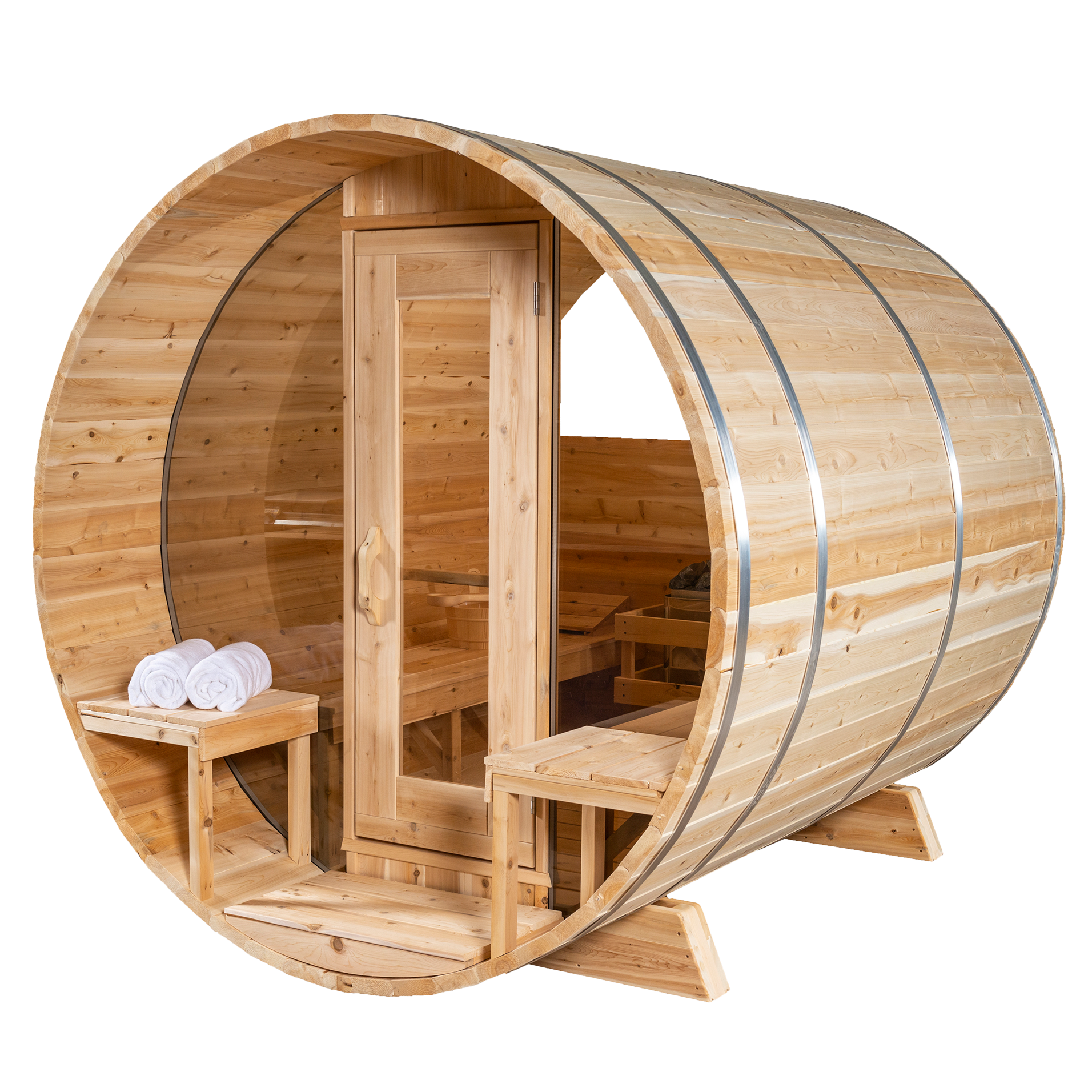 This Canadian Timber Collection Sauna by Dundalk LeisureCraft is handcrafted from Eastern White Cedar that is lighter in color and has tight knots in the wood. The door is 5mm bronze tempered glass with wooden frame and pre-hung on the front wall for easy installation.
