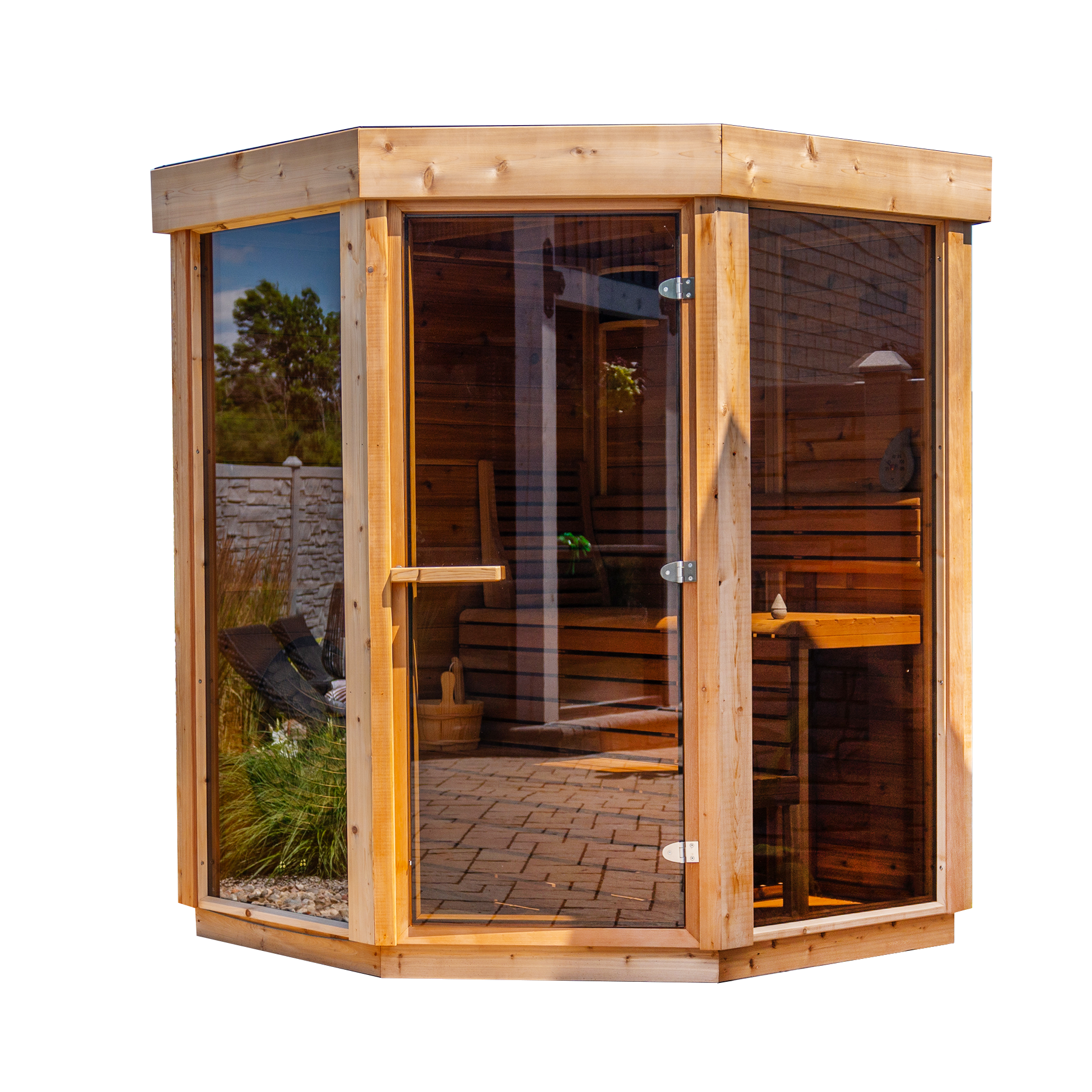 Our Pure Cube Trinity Sauna is a 5 Sided Corner model that will comfortably seat 2 people and fit onto an small deck or patio at your Condo or Cottage! Made with western red cedar and tempered glass windows this model as a special design flat plastic roof tray for year round use.